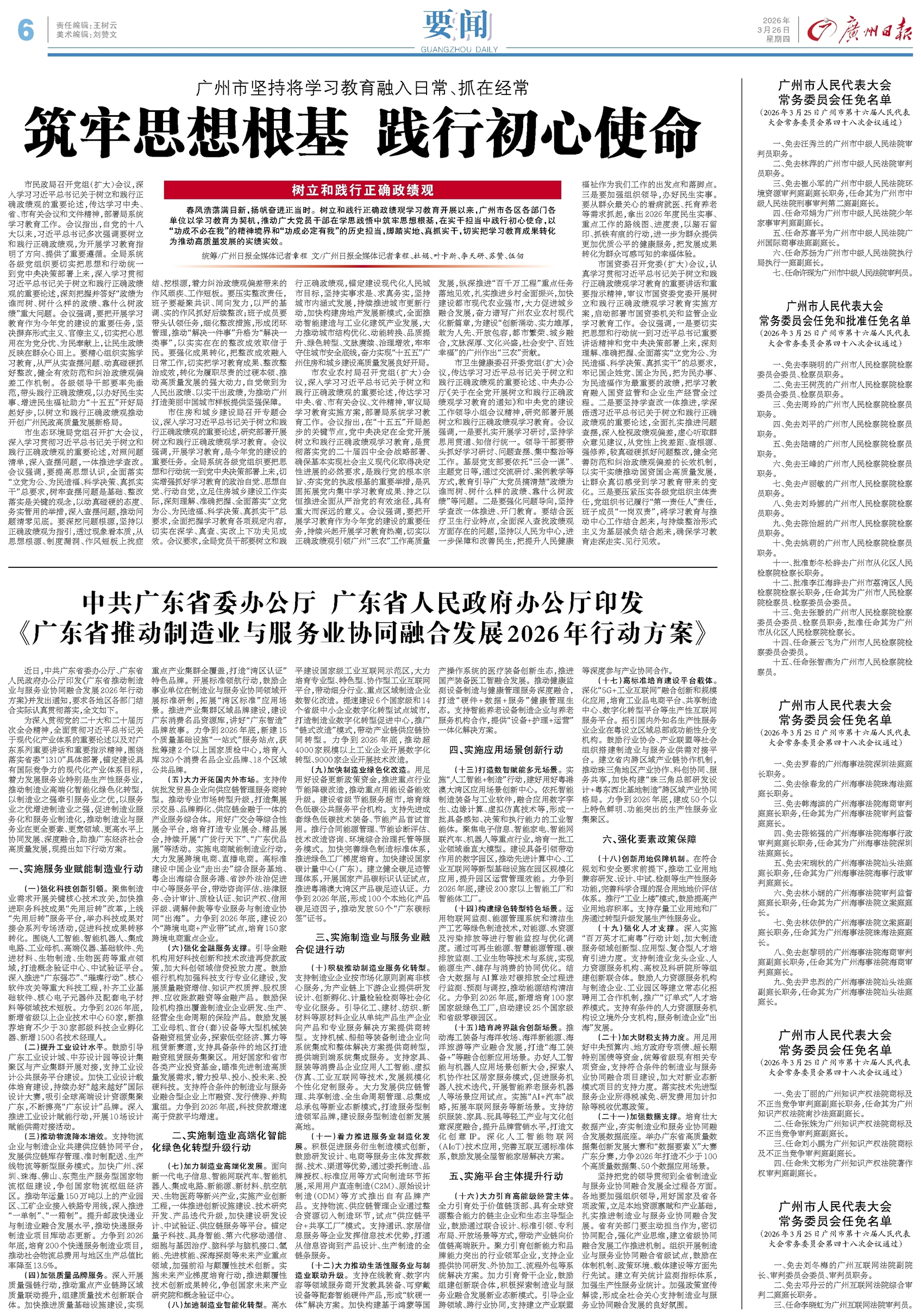 - 筑牢思想根基 践行初心使命 春风浩荡满目新,扬帆奋进正当时。树立和践行正确政绩观学习教育开展以来,广州市各区各部门各单位以学习教育为契机,推动广大党员干部在学思践悟中筑牢思想根基,在实干担当中践行初心使命,以“功成不必在我”
