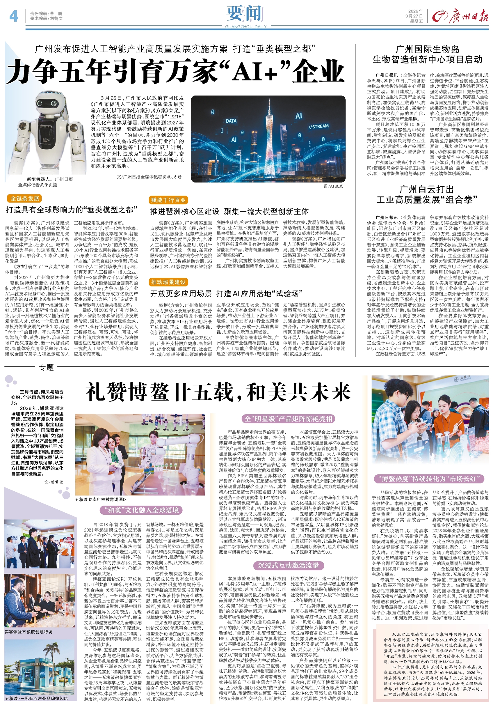 - 力争五年引育万家“AI+”企业 3月26日,广州市人民政府官网印发《广州市促进人工智能产业高质量发展实施方案》(以下简称《方案》)。《方案》立足广州产业基础与场景优势,围绕全市“12218”现代化产业体系部署,明确提出到2027