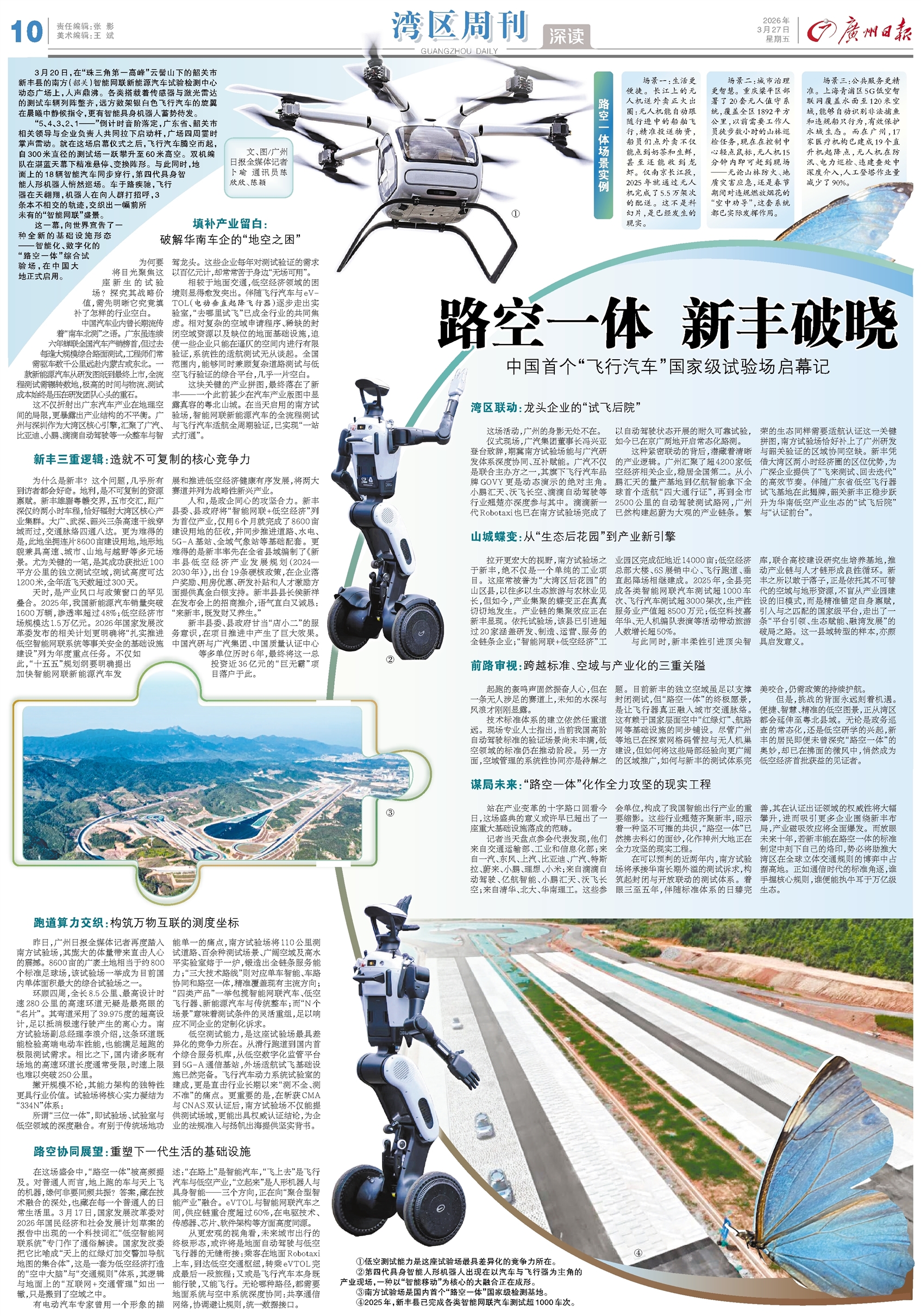 3月20日,在“珠三角第一高峰”云髻山下的韶关市新丰县的南方(韶关)智能网联新能源汽车试验检测中心动态广场上,人声鼎沸。各类搭载着传感器与激光雷达的测试车辆列阵整齐,远方数架银白色飞行汽车的旋翼