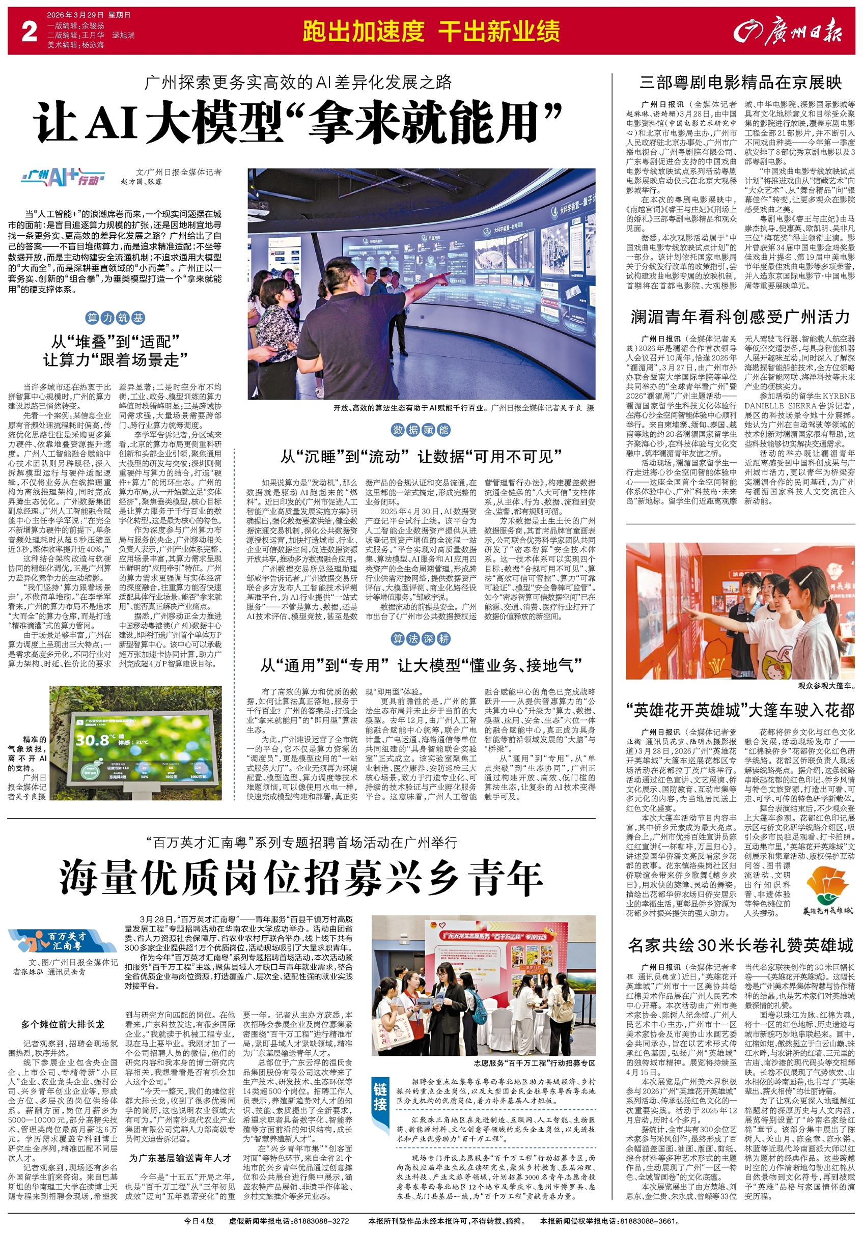 - 海量优质岗位招募兴乡青年 百万英才汇南粤 文、图/广州日报全媒体记者张姝泓 通讯员岳青 3月28日,“百万英才汇南粤”——青年服务“百县千镇万村高质量发展工程”专题招聘活动在华南农业大学成功举办。活动由团省委