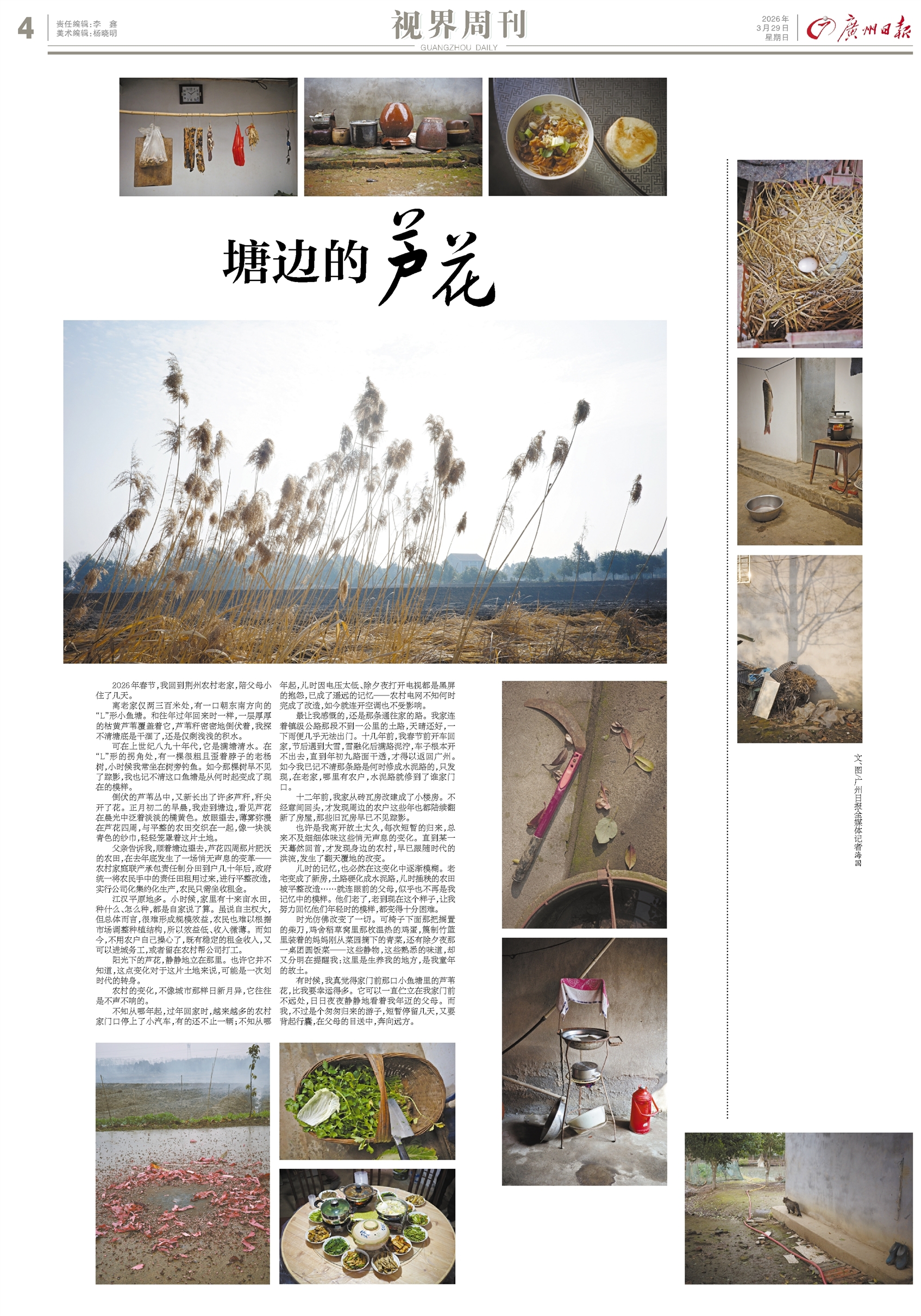 • 塘边的芦花   文、图/广州日报全媒体记者海国   2026年春节,我回到荆州农村老家,陪父母小住了几天。   离老家仅两三百米处,有一口朝东南方向的“L”形小鱼塘。和往年过年回来时一样,一层厚厚的枯黄芦苇