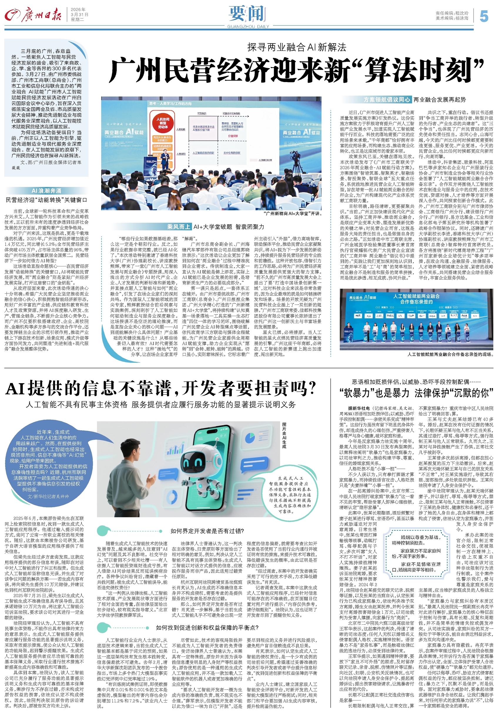 - 广州民营经济迎来新“算法时刻” 三月底的广州,春意盎然。一场聚焦人工智能与民营经济发展的盛会,吸引了来自政、企、学、金等各界的300多名代表参加。3月27日,由广州市委统战部、广州市工商联(总商会)、广州市工业和信息化局联合主