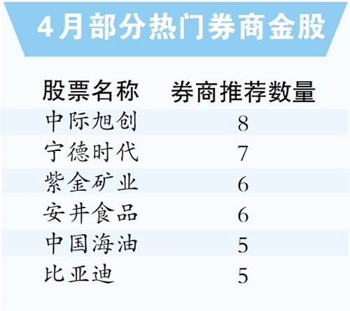 震荡市场中,如何寻找优质标的?券商金股无疑是重要的参考指标。在近300只4月券商金股推荐中,中际旭创获8家券商集体推荐,成为4月金股推荐次数最多的个股;宁德时代、紫金矿业、安井食品、中国海油、比亚迪等个股均被5家以上券商机构推荐。从行业分布来看,4月电力设备、有色金属、通信、电子等行业金股数量占比靠前,科技成长相关领域成为机构关注、布局的核心方向。