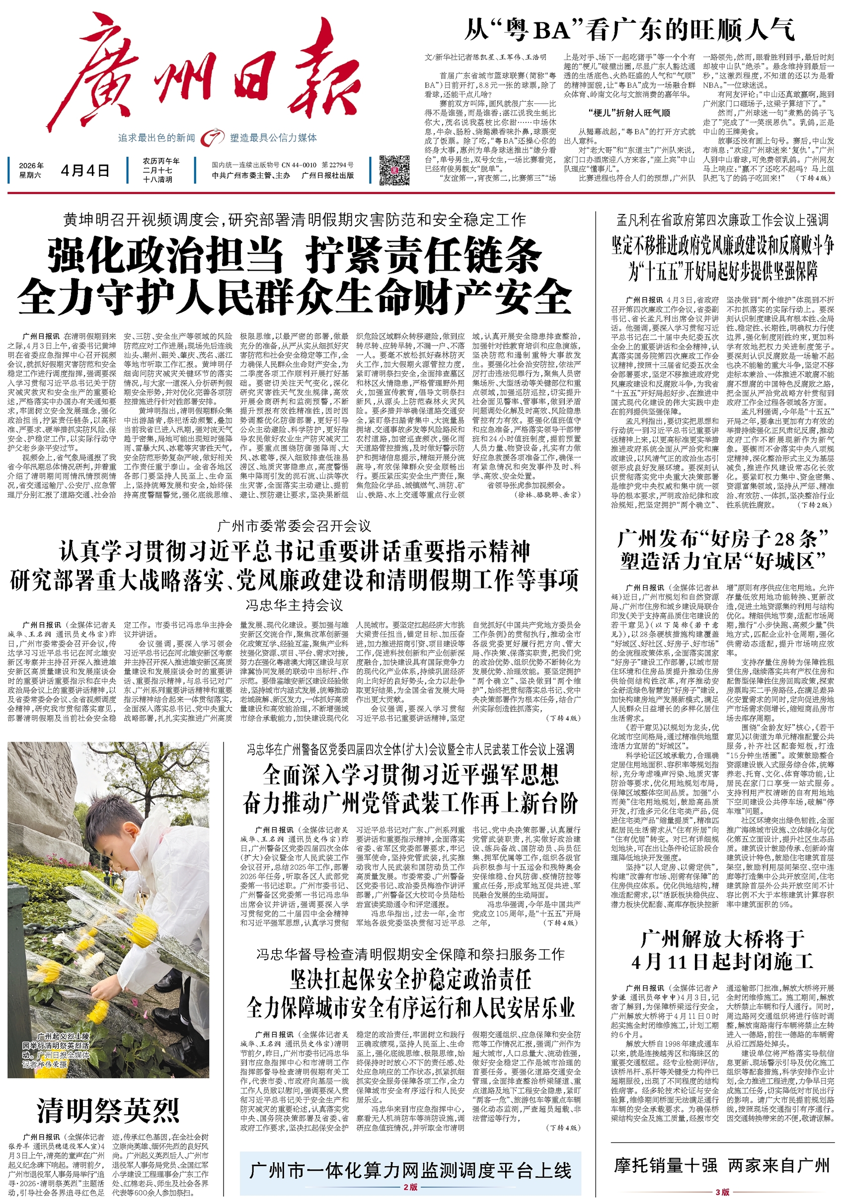广州日报头版 A1从“粤BA”看广东的旺顺人气 陈凯星、王军伟、王浩明2026-04-04 2 2026年04月04日 星期六