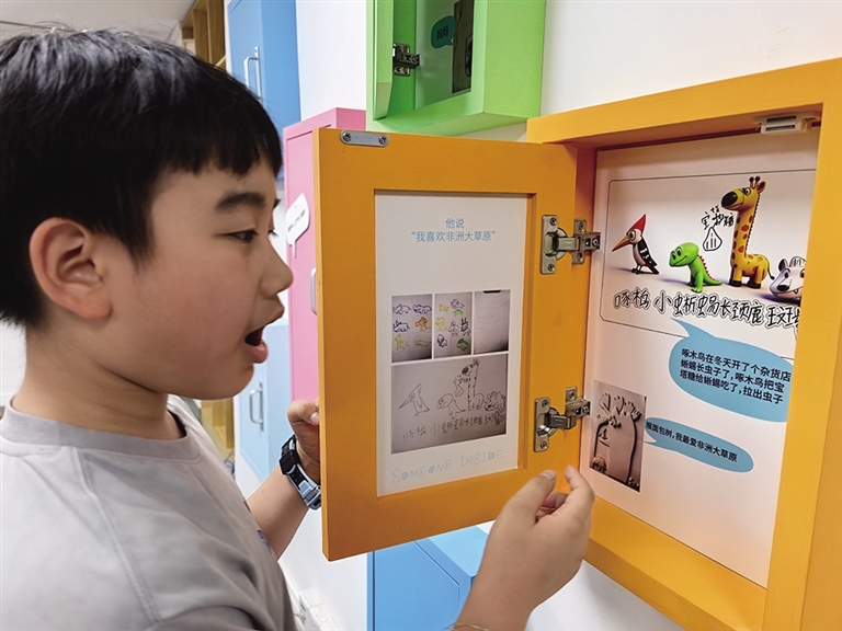 这是一个叫“里面有人”的艺术展览。它源于2025年艺术家周鲒与60个特殊孩子的一对一陪伴计划。在这些孩子中,有孤独症谱系儿童,有唐氏综合征孩子,有发育迟缓的少年。一年里,每个孩子与艺术家相处陪伴一小时,画画、撕纸、涂鸦,或者什么都不做。这不是一次“治疗”。项目发起者刻意避开了“疗愈”这个词,他们称之为“疗育”——疗愈是修补,疗育是生长。不设目标,没有标准,只有一个约定:你画你想画的,我看着,于是有了这些画。将这些画展出,周鲒作了大胆的设计:整个展览由一扇扇门构成。这些特殊儿童以往经常以“门”去隔绝与外界的沟通,而我们试图叩响它,礼貌地请求,得到允许后方可走进特殊孩子内心。门里面有一段图像对话,以及疗育期间的“情景还原”。展览中,有些门不能打开,贴着提示“里面有人,打不开,别硬开”,这是展览刻意的留白,提示我们不能硬闯别人的心门。