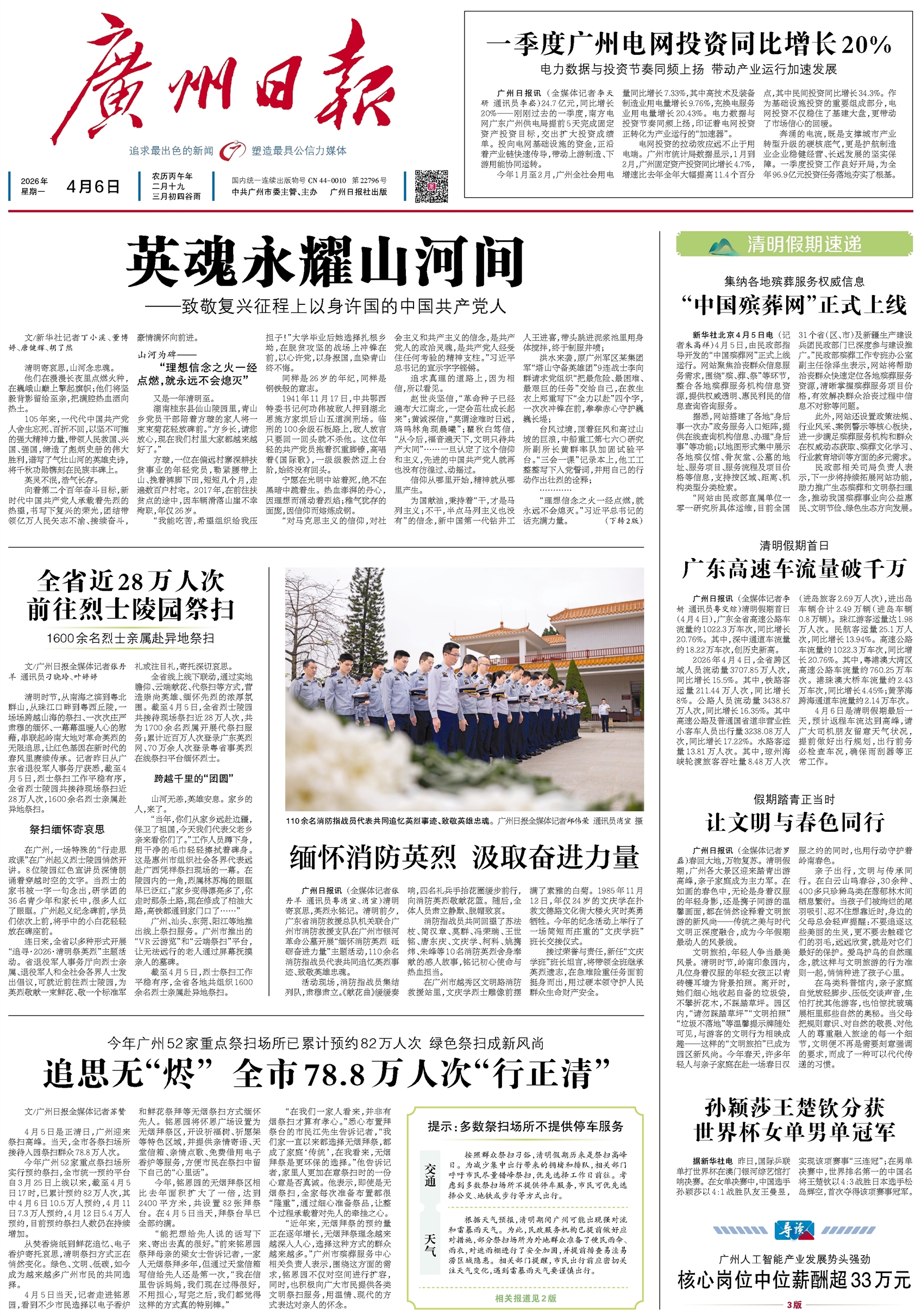 - 追思无“烬” 全市78.8万人次“行正清” 文/广州日报全媒体记者苏赞 4月5日是正清日,广州迎来祭扫高峰。当天,全市各祭扫场所接待入园祭扫群众78.8万人次。 今年广州52家重点祭扫场所实行预约祭扫,全市统一预约平台自3月25日上