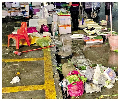 记者在富鹏新街市内看到,地面垃圾较多,污水横流,多个档口没有落实“门前三包”,货物占道摆卖、垃圾乱堆放。入夜后,部分档口结束营业,但档口没有做好环境清洁,造成市场内垃圾遍地,通道里堆满货物。直至结束营业,市场内还有多辆电动自行车、摩托车和电动三轮车停放。