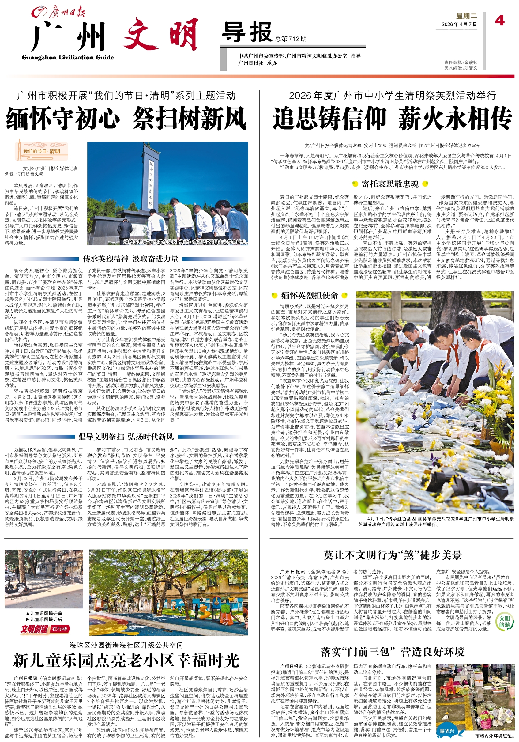 - 追思铸信仰 薪火永相传 文/广州日报全媒体记者章程 实习生丁欣 通讯员穗文明 图/广州日报全媒体记者陈忧子 一年春草绿,又是清明时。为广泛培育和践行社会主义核心价值观,深化未成年人爱国主义与革命传统教育,4