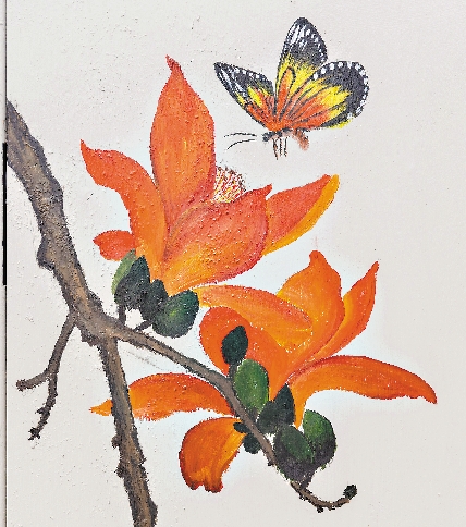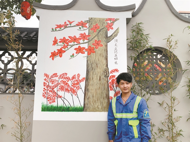 骆仕岳先是在沙河地铁站C出口景观小品墙背后画了一幅《顶天立地英雄花》,栩栩如生的花朵和枝叶,尽显生机勃勃,作品大受好评。恰逢街道准备开展扮靓电箱计划,在工友们的鼓励下,骆仕岳主动提出参与电箱绘画,街道为其购置了绘画工具和颜料。