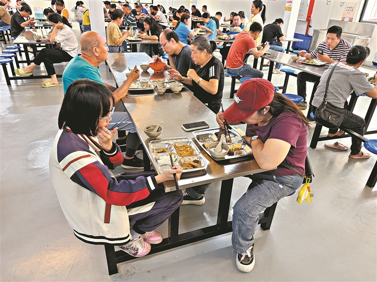 记者近日走访了该餐厅。餐厅入口设有智能闸机,顾客手机扫码支付6元后,闸机开启,即可入内自由取餐。顾客中有建筑工人、产业工人,也有西装革履的白领,还有结伴而来的母女。12时许,餐厅的队伍已经排起了长龙。素菜、米饭、汤由顾客自助取用,肉菜由工作人员添加。顾客可加菜,鸡腿4元,其他肉菜3元。