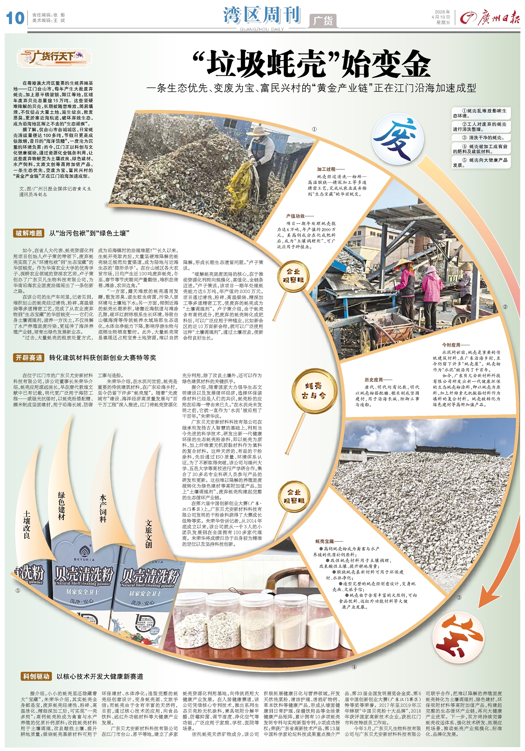 广货行天下 在粤港澳大湾区重要的生蚝养殖基地——江门台山市,每年产生大批废弃蚝壳,加上恩平横陂镇、阳江等地,区域年废弃贝壳总量逾15万吨。这些坚硬难降解的贝壳,长期被随意堆放、简易填埋,不仅侵