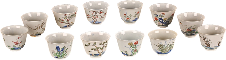 一进入展厅,迎面便是可以与今年春晚“十二花神”相呼应的青花五彩十二月花卉杯。这套杯具通体施白釉,杯体均为薄胎,透光润泽,晶莹细腻,杯壁用青花五彩绘十二月花卉纹并题写相对应诗句。纹饰色彩鲜丽清新,绘制生动自然,所绘花卉分别是:一月水仙花、二月玉兰花、三月桃花、四月牡丹花、五月石榴花、六月荷花、七月兰花、八月桂花、九月菊花、十月芙蓉花,十一月月季花、十二月梅花。