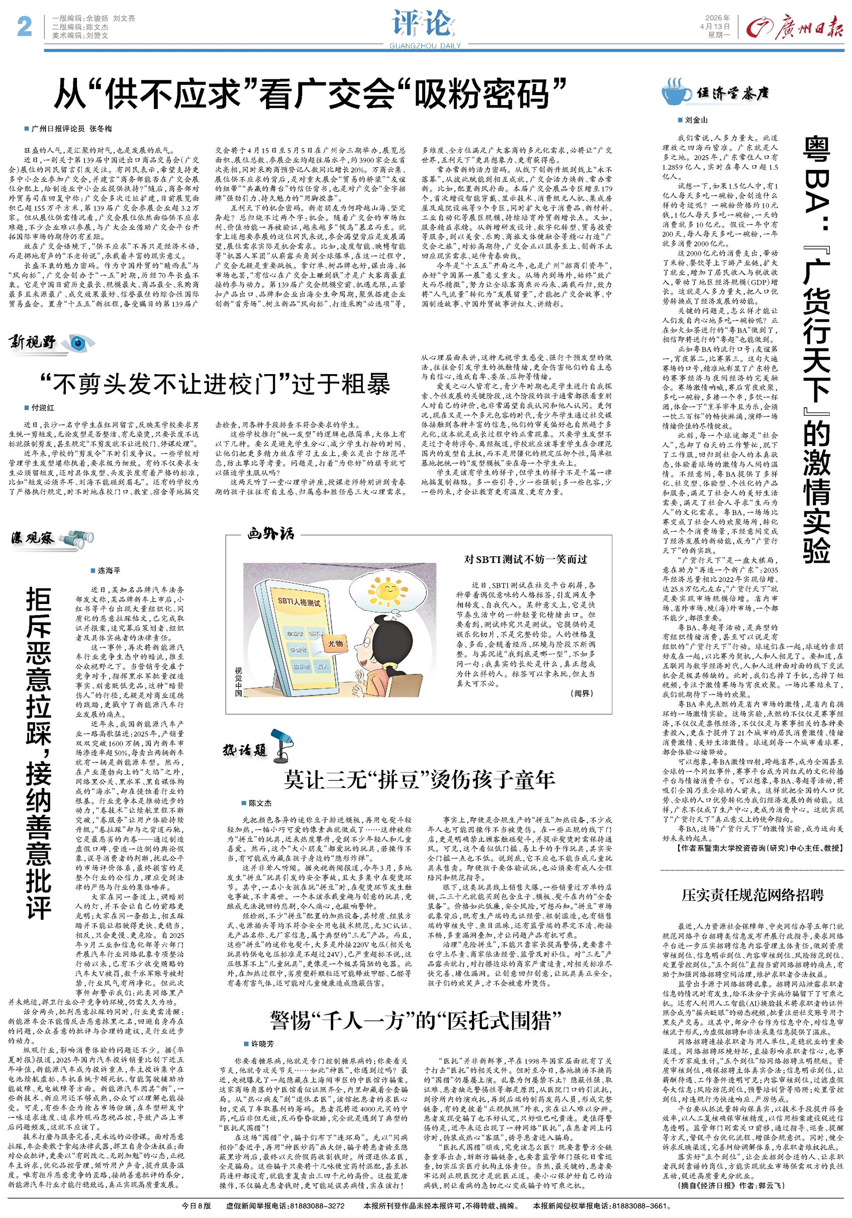 - 从“供不应求”看广交会“吸粉密码” 广州日报评论员 张冬梅 旺盛的人气,是汇聚的财气,也是发展的底气。 近日,一则关于第139届中国进出口商品交易会(广交会)展位的网民留言引发关注。有网民表示,希望支持更多中小企业参加广交会
