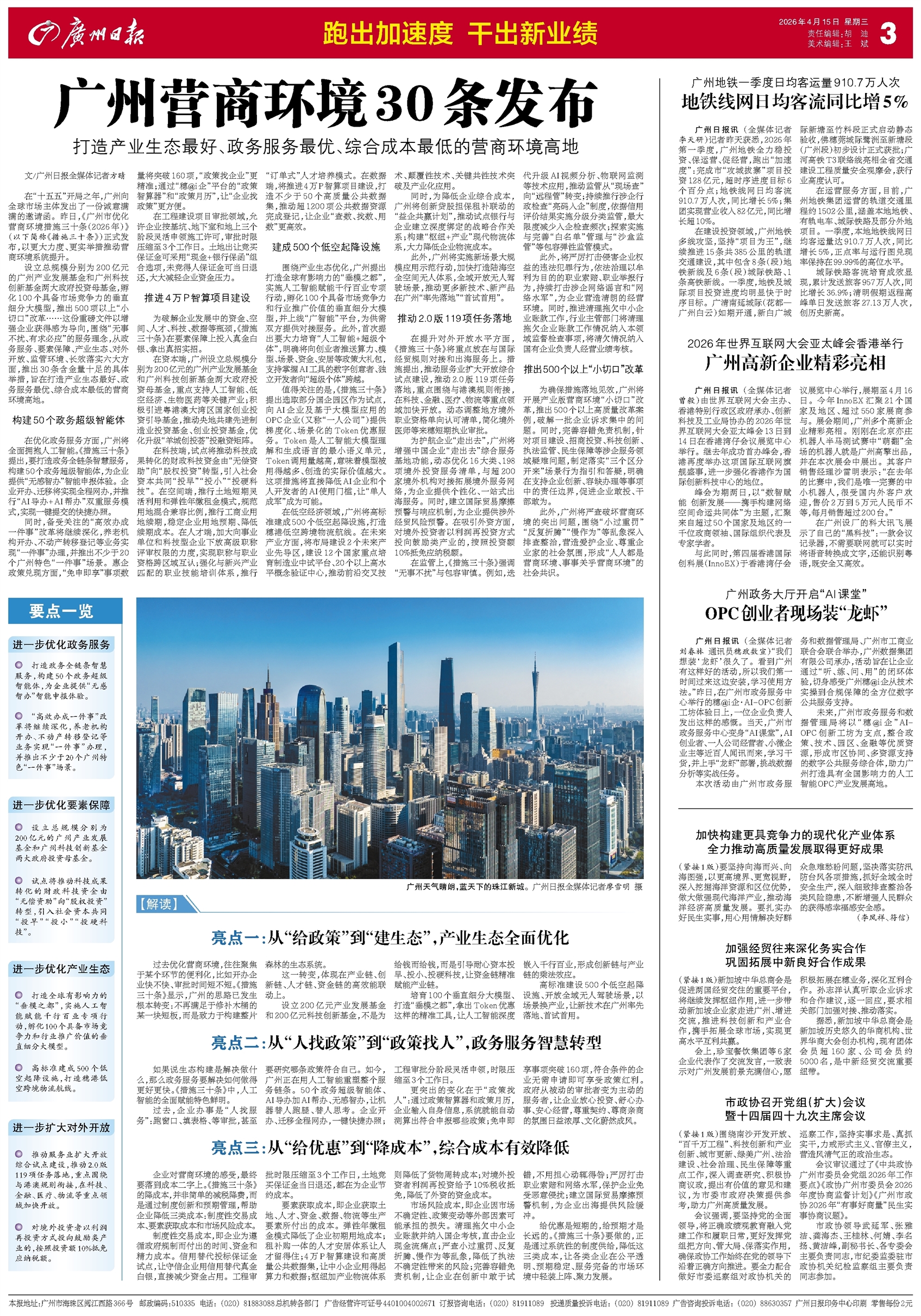 - 广州营商环境30条发布 文/广州日报全媒体记者方晴 在“十五五”开局之年,广州向全球市场主体发出了一份诚意满满的邀请函。昨日,《广州市优化营商环境措施三十条(2026年)》(以下简称《措施三十条》)正式发布,以更大力