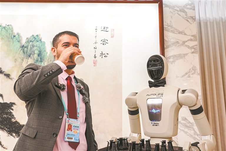 奥萨马·阿里法伊手中收到的由无人机配送的奶茶,在分分钟都能谈上大生意的广交会上,完美体现了速度、效率与科技的融合。无人机企业带来的“低空经济+即时配送”的全链条解决方案,打通了从用户手机点单、无人机自动调度、空中配送,到配送机器人送达的完整闭环,这种科幻感十足的场景在广交会场馆中的出现,让国际客商切身感受到科技走进日常生活的美妙。