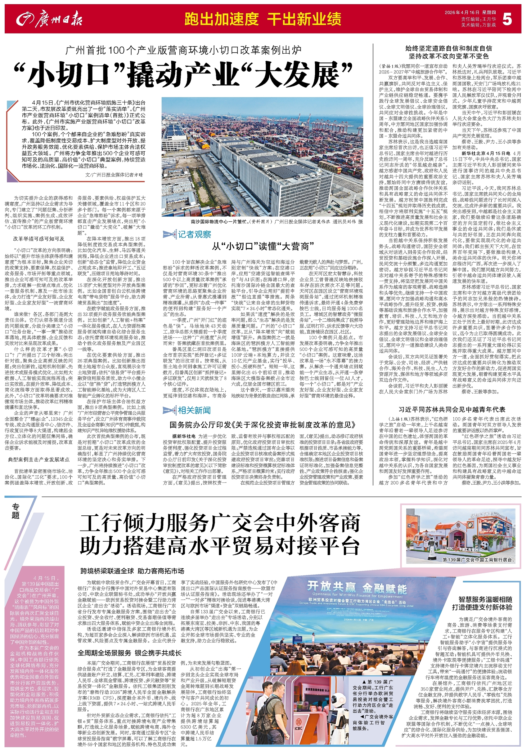 - “小切口”撬动产业“大发展” 4月15日,《广州市优化营商环境措施三十条》出台第二天,市发展改革委就亮出了一份“落实清单”。《广州市产业版营商环境“小切口”案例清单(首批)》正式公布。此外,《广州市实施产业版营商环境“小切口”
