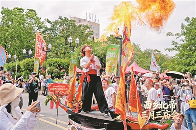 揭阳潮乐团已是第四次参加“西乡北帝三月三庙会”。该乐团领队带着9岁的儿子登上了巡游表演车。他告诉记者,乐团每次来都会有创新,希望在创新中传承好非遗。