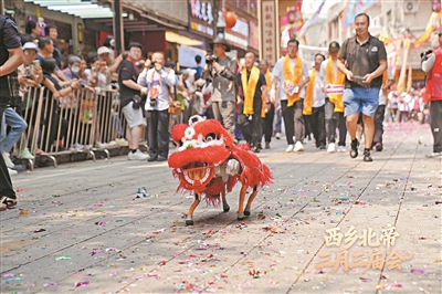 与此同时,庙会采用“流动巡游+定点展演”模式,在沿线设置醒狮表演区、非遗互动区、美食体验区,让真理街、巡抚街等古街巷重焕生机,地道烟火气与文创雅致相映成趣,让市民在逛、赏、品、购中沉浸式感受民俗魅力。
