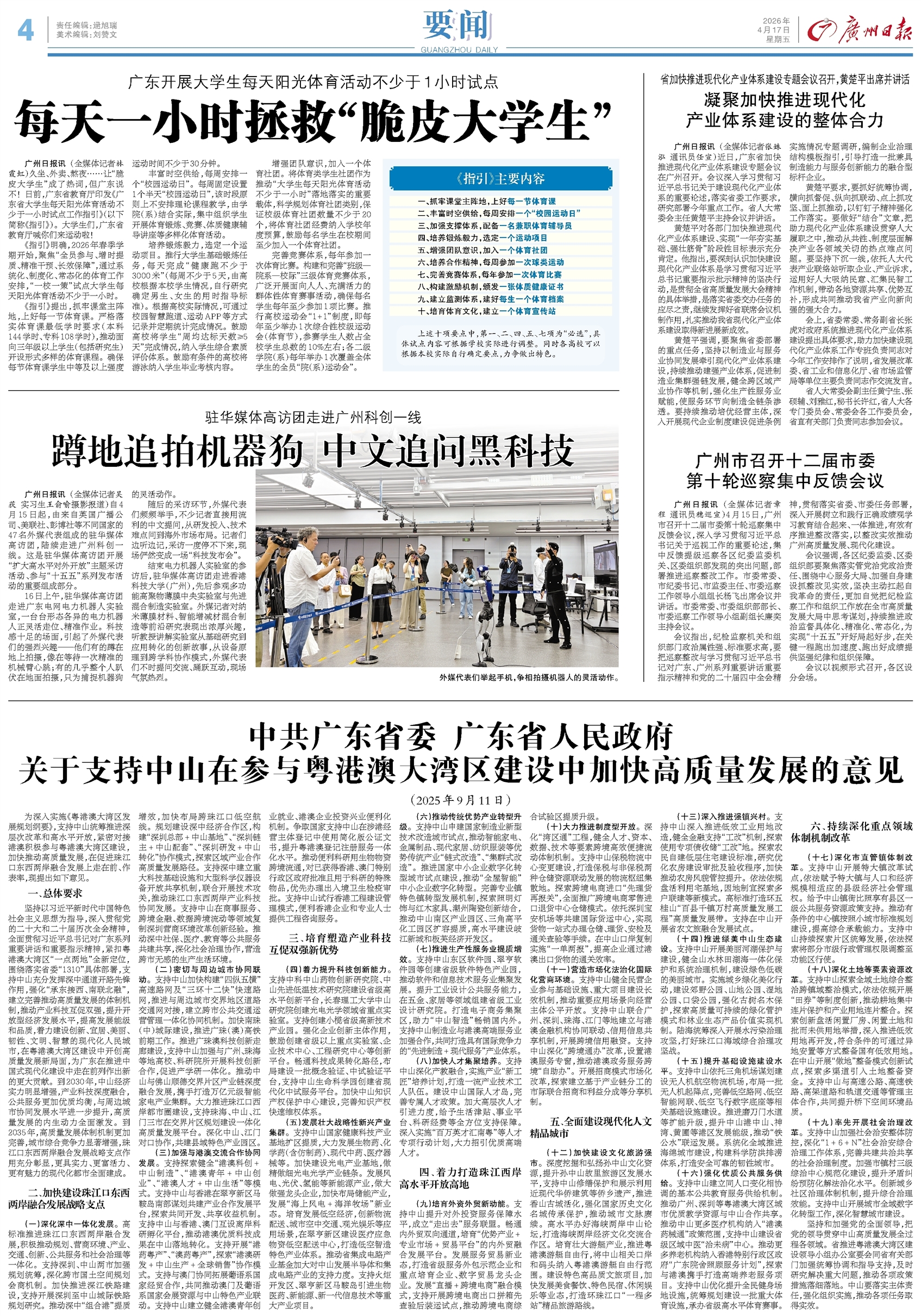 - 中共广东省委 广东省人民政府关于支持中山在参与粤港澳大湾区建设中加快高质量发展的意见 为深入实施《粤港澳大湾区发展规划纲要》,支持中山统筹推进深层次改革和高水平开放,紧密对接港澳积极参与粤港澳大湾区建设,加快推动高质量发展,在促进珠江口东西两岸融合发展上走在前、作表率,现提出如下