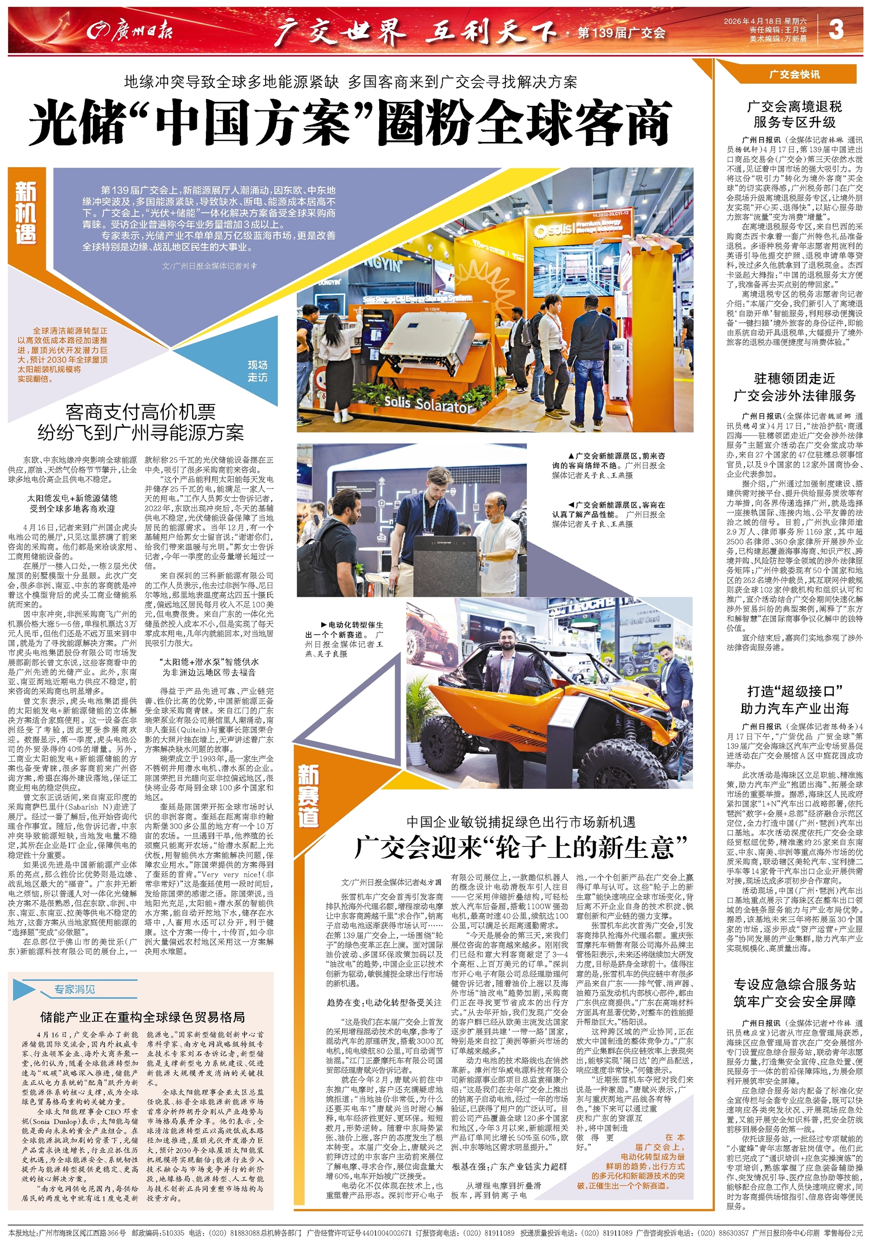 - 广交会迎来“轮子上的新生意” 文/广州日报全媒体记者赵方圆 张雪机车广交会首秀引发客商排队抢海外代理名额,增程滚动电摩让中东客商跨越千里“求合作”,钠离子启动电池逐渐获得市场认可……在第139届广交会上,一场围绕“轮子”的