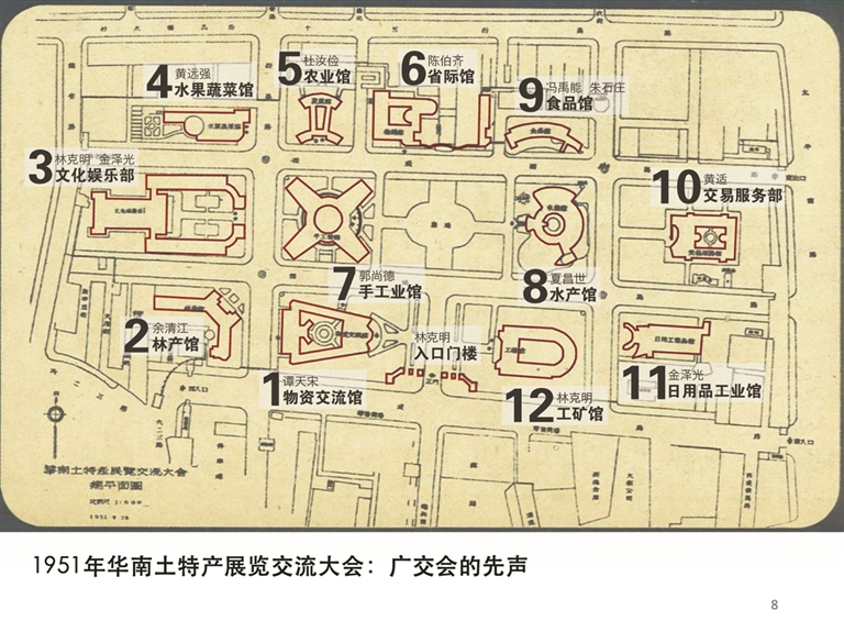 从历史延续看,这一展会为后续发展奠定基础。1951年大会闭幕后,叶剑英指示将会场建筑保留,成立“岭南文物宫”(后为广州文化公园)。其中省际馆、水产馆、水果蔬菜馆、手工业馆成为永久性展馆,并被评为广州市第一批历史建筑。1955年至1956年,同一场地先后举办华南物资交流大会和广东省出口物资展览交流会,名称由“华南”转为“广东”,并首次出现“出口”二字,功能由城乡物资交流转向以对外贸易为主。正如相关研究所言,这一阶段“为广交会奠定了良好的基础”。