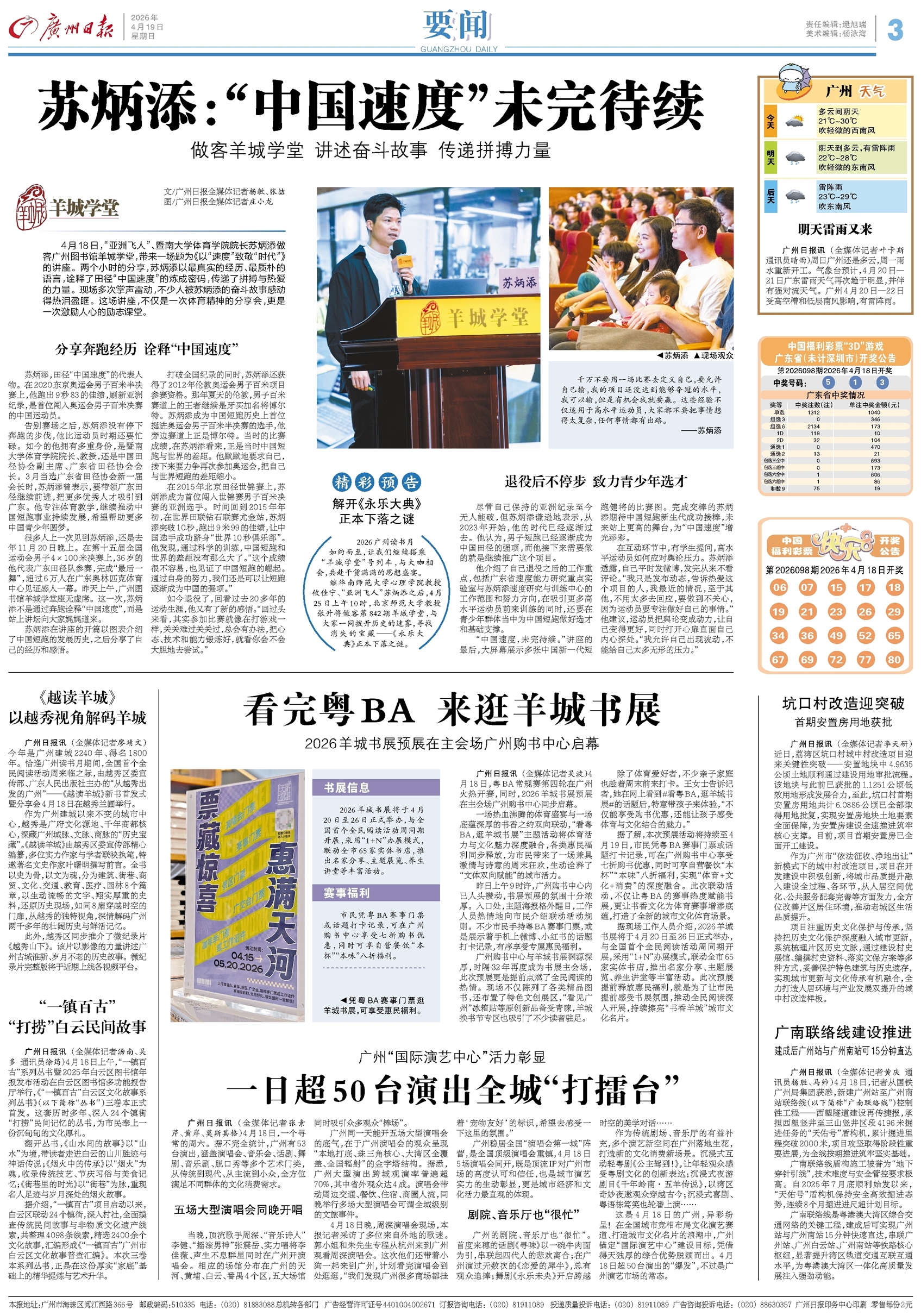 - 苏炳添:“中国速度”未完待续 羊城学堂 文/广州日报全媒体记者杨敏、张喆 图/广州日报全媒体记者庄小龙 4月18日,“亚洲飞人”、暨南大学体育学院院长苏炳添做客广州图书馆羊城学堂,带来一场题为《以“速度”致