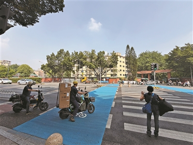 “针对部分路口、路段非机动车通行困难、安全隐患突出的问题,我们持续开展‘微改造、微更新’工作。广州首创开展的‘机非共享车道’试点工作已被纳入国家标准,为全国电动自行车综合治理提供了‘广州经验’。”李警官说。围绕非机动车道优化、路口渠化改造、交通信号配时调整、安全防护设施增设等重点,截至目前,广州已设置81条、总长65.7公里“机非共享车道”,中心城区140个重点路口已完善标志标线、铺设蓝色铺装,明晰非机动车通行与等待区域。