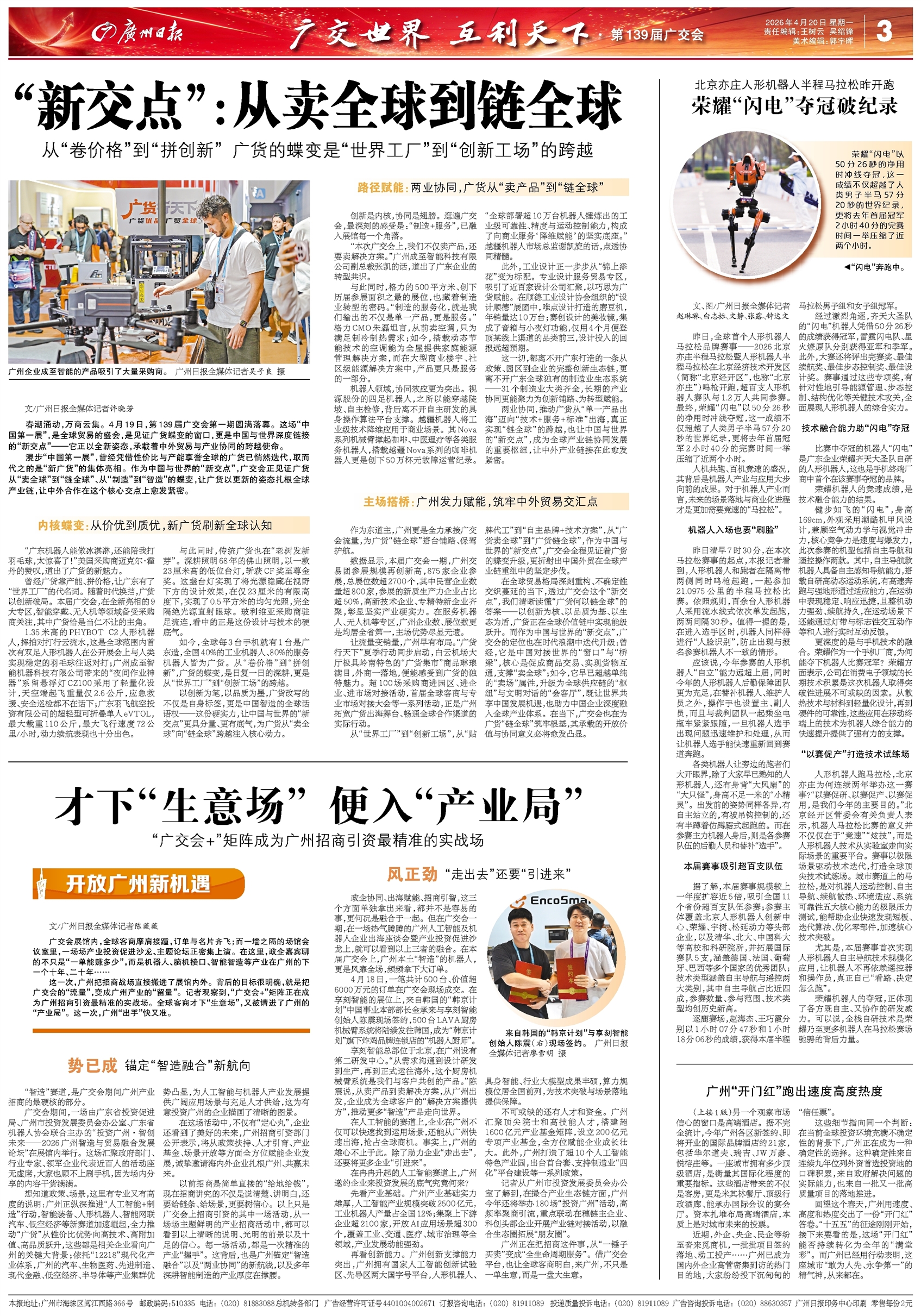 - “新交点”:从卖全球到链全球 文/广州日报全媒体记者许晓芳 春潮涌动,万商云集。4月19日,第139届广交会第一期圆满落幕。这场“中国第一展”,是全球贸易的盛会,是见证广货蝶变的窗口,更是中国与世界深度链接的“新交点”——