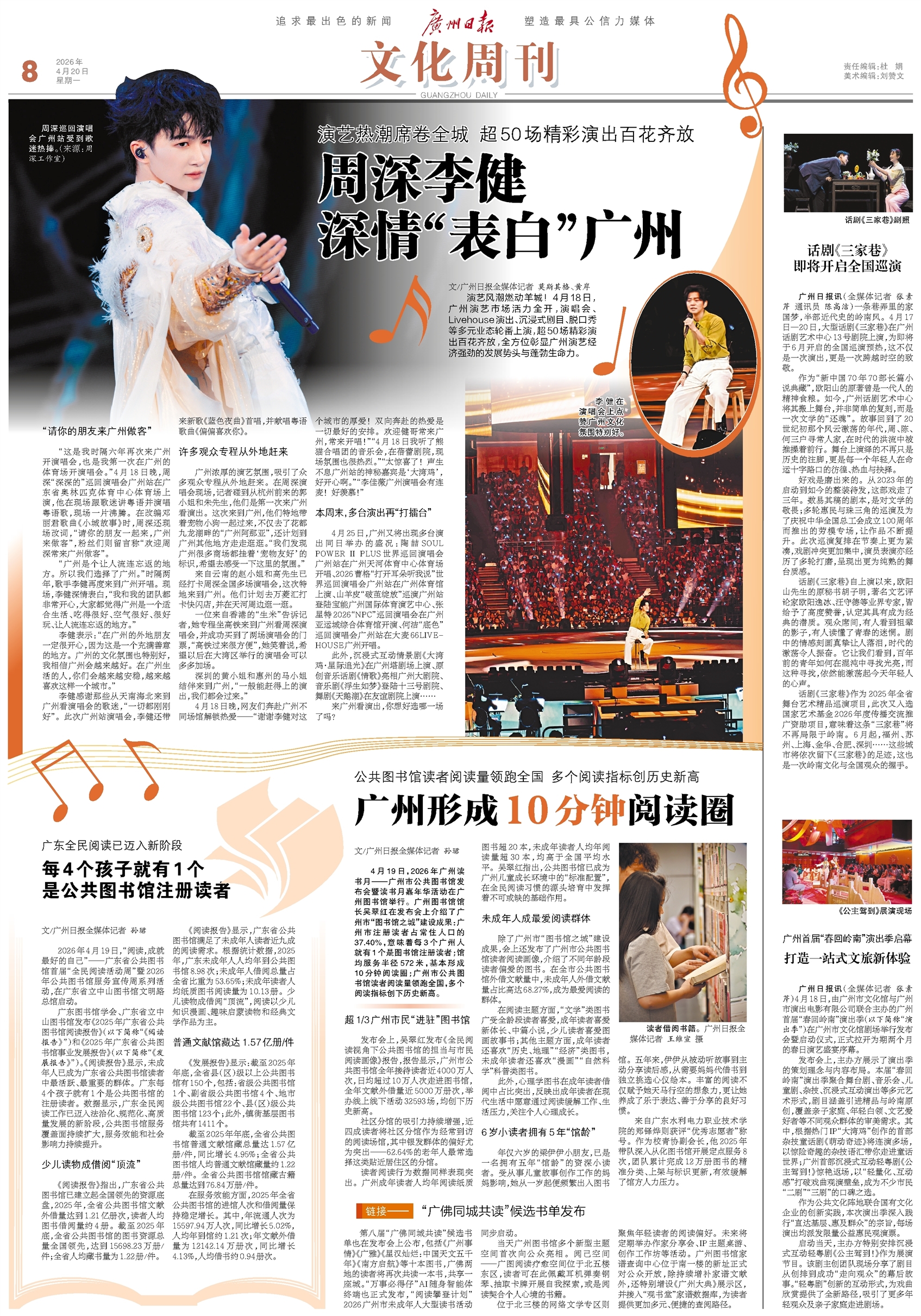 - 周深李健深情“表白”广州 文/广州日报全媒体记者 莫斯其格、黄岸 演艺风潮燃动羊城!4月18日,广州演艺市场活力全开,演唱会、Livehouse演出、沉浸式剧目、脱口秀等多元业态轮番上演,超50场精彩演出百花齐放,全方