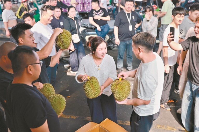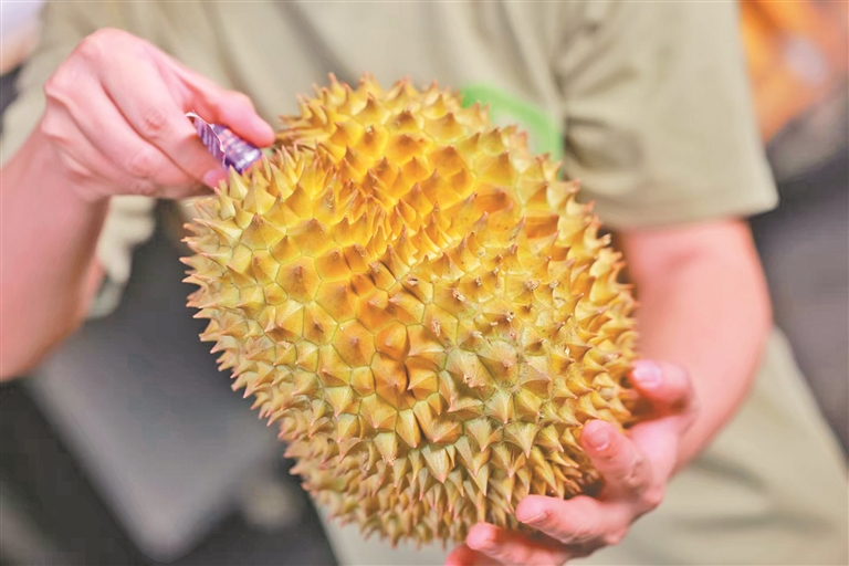 “塔曼妮这个品牌我拿了很多次,品质一直很稳定。今天装了200件,销往海南和长沙。”采购商谢先生告诉记者,他最看重榴莲果肉品质,“肉够黄、干爽、口感好。现在消费者都要干包黄肉,拿好货必须提前预订。”