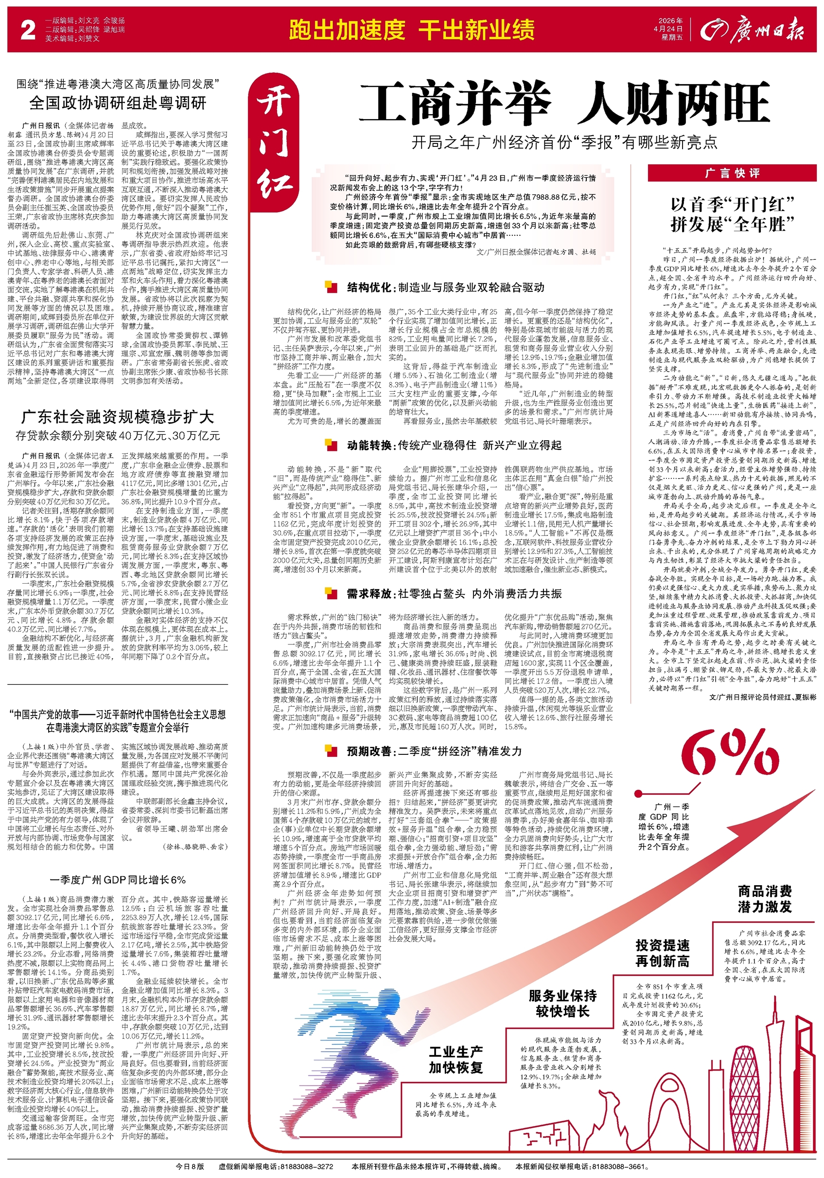 - 以首季“开门红” 拼发展“全年胜” 广言快评 “十五五”开局起步,广州起势如何? 昨日,广州一季度经济数据出炉!据统计,广州一季度GDP同比增长6%,增速比去年全年提升2个百分点,超全国、全省平均水平。广州经济运行回升向好、