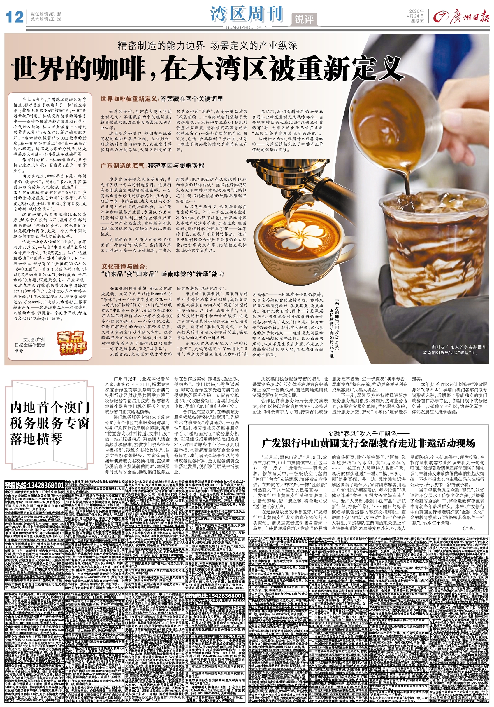 - 世界的咖啡,在大湾区被重新定义 文、图/广州日报全媒体记者曹菁 早上七点半,广州珠江新城的写字楼里,程序员在手机端点了一杯“陈皮冷萃”;肇庆七星岩下的“村咖”里,一杯“裹蒸拿铁”刚刚出杯就交到健步的游客手中——咖啡师用肇