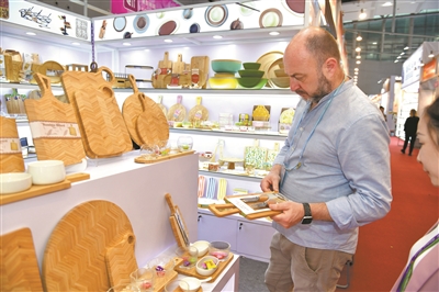走进全新设立的竹木餐具专区,绿色成为最热关键词。龙竹科技集团股份有限公司展位前,一位中东客商正反复弯折手中的竹吸管,确认其韧性后,当场索要了样品册。展位负责人一边演示一边介绍说:“竹子的生长周期只需3到5年,以竹代树、以竹代塑是近年来的新趋势,我们的产品越来越受欢迎。”不远处,重庆瑞竹植物纤维制品有限公司的展位也吸引了不少采购商。企业集中展出三大系列新品,涵盖全竹纤维可降解餐盒、航空级竹纤维餐具及多功能竹制家居容器。一位欧洲采购商拿起一只竹纤维餐盒端详,得知其生产全程不添加化学助剂,既可耐受零下40℃的低温,也可放进微波炉、烤箱内加热,且已通过美国FDA、德国LFGB等多项国际食品级权威认证后,当即表示“回去就发采购清单”。
