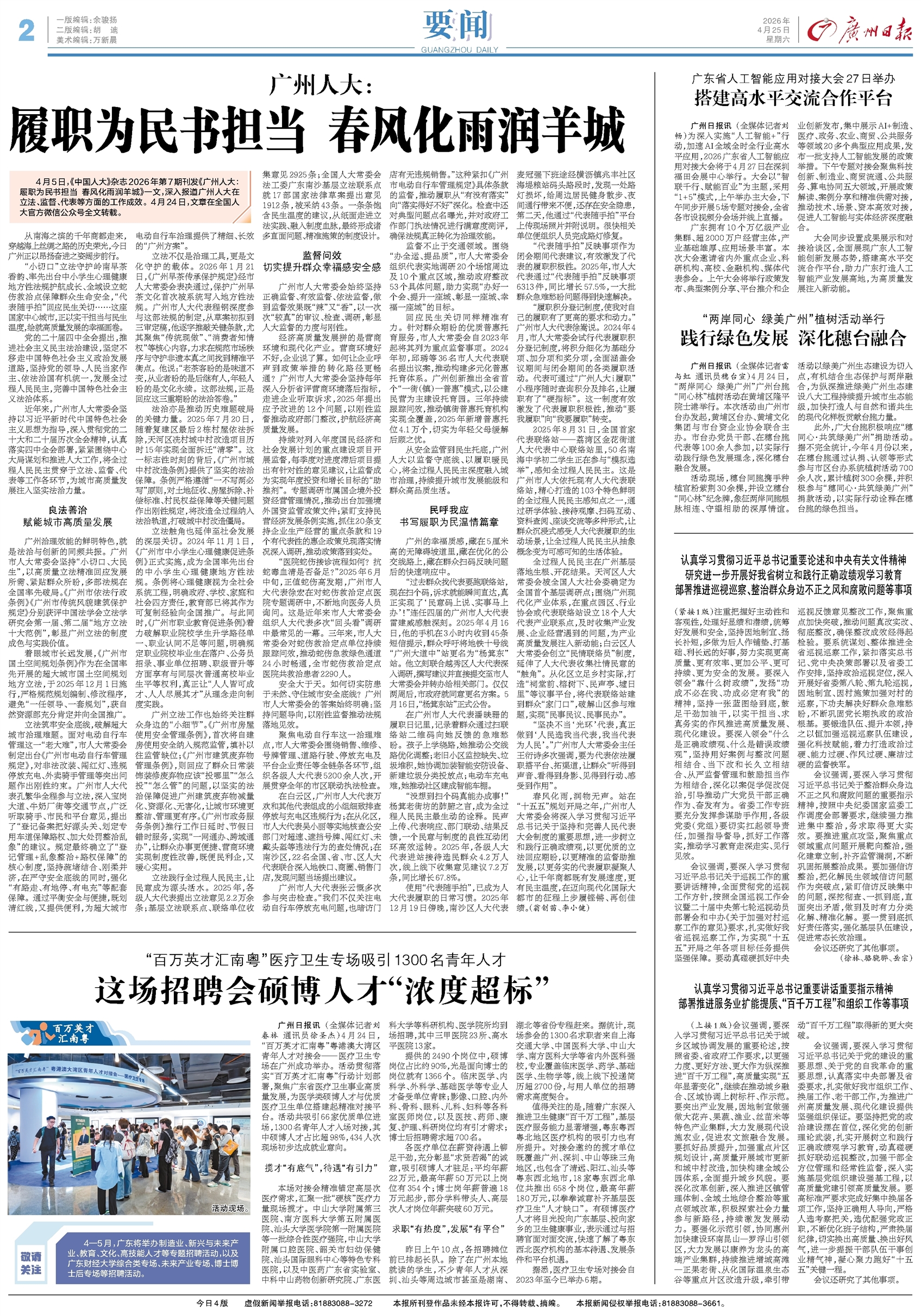 - 广州人大:履职为民书担当 春风化雨润羊城 4月5日,《中国人大》杂志2026年第7期刊发《广州人大:履职为民书担当 春风化雨润羊城》一文,深入报道广州人大在立法、监督、代表等方面的工作成效。4月24日,文章在全国人大官方微信公众号全文转