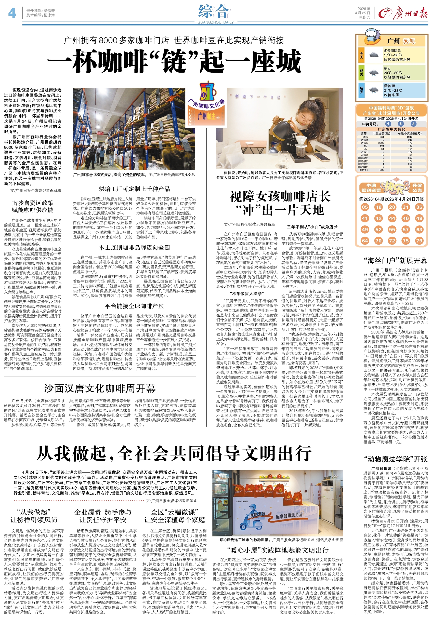 - 一杯咖啡“链”起一座城 恒温恒湿仓内,通过南沙港进口的咖啡生豆叠放在货架上;烘焙工厂内,两台大型咖啡烘焙机正烘出浓香;连锁品牌运营中心里,咖啡师正将茶与咖啡按比例融合,制作一杯当季特调……这是4月24日,广州日报记者调