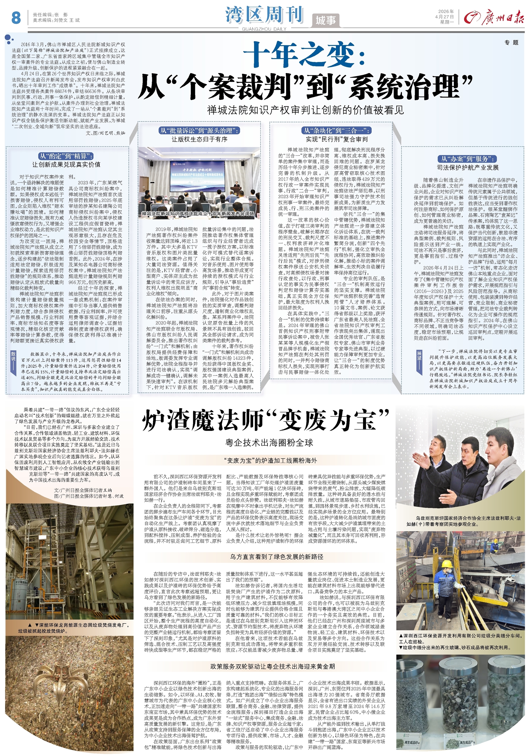 - 十年之变:从“个案裁判”到“系统治理” 2016年3月,佛山市禅城区人民法院新城知识产权法庭(以下简称“禅城法院知产法庭”)正式挂牌成立,这是全国第二家、广东省首家跨区域集中管辖全市知识产权一审案件的专业法庭,从成立之初,便与佛山制造