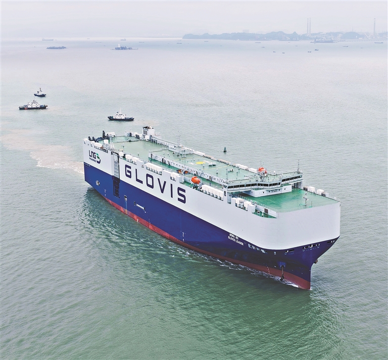 广州日报讯 (全媒体记者耿旭静 通讯员王周乐、彭永桂、黎海生、渠莹摄影报道)昨日,中船广船国际联合中船贸易为韩国HMM航运建造的全球首艘10800车汽车运输船(PCTC)“格罗唯视 领航”轮在广州南沙命名交付。该船单船最大装车量达10800辆,刷新全球同类船舶运力纪录,标志着我国高端船舶制造能力实现新突破,为全球航运业绿色低碳转型提供了“中国方案”。